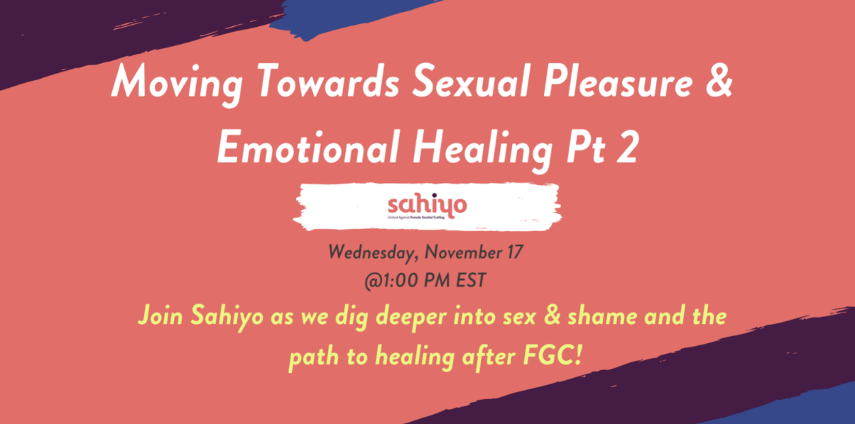 On November 17th, Sahiyo hosted part two of the ‘Moving Towards Sexual Pleasure and Emotional Healing After Female Genital Cutting’ webinar. Two specialist speakers helped to lead the webinar: Haddi Ceesey, a health educator on sexual and reproductive health, and Nazneen Vasi, an expert in physical and pelvic floor therapy. Nazneen began by asking the […]